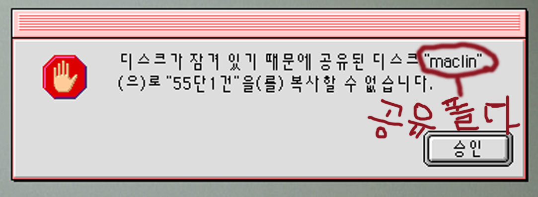 맥랜 설치는 PC에 되어있구요. 맥은 에플쉐어로 연결해서 방문객으로 들어가면 PC에 있는 데이타는 가져올 수가 있는데 맥에서 PC공유폴다에 테이타를 넣으면 에러가 뜹니다. "스크가 잠겨있어서 공유폴더에 복사할수 없다" 메세지가 뜹니다.